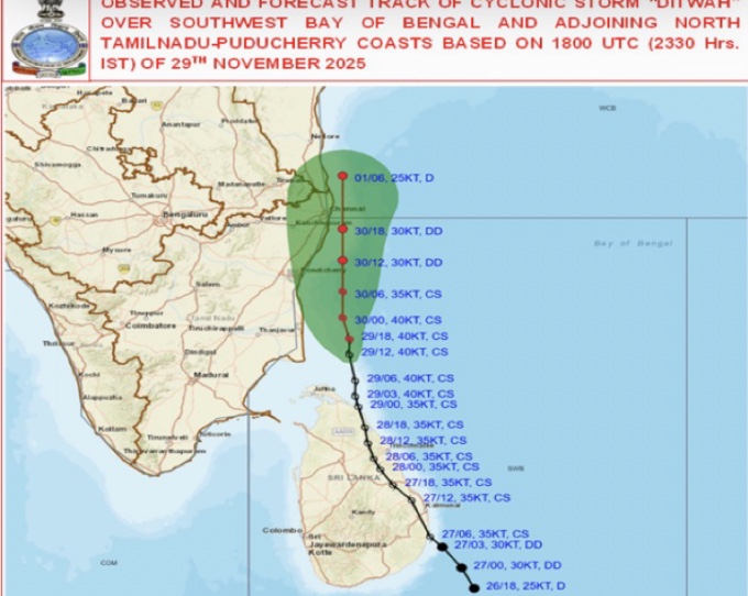 दक्षिण-पश्चिम बंगाल की खाड़ी और उससे सटे उत्तरी श्रीलंका तथा तमिलनाडु तट पर बने चक्रवाती तूफान दित्वा की रफ्तार पिछले 6 घंटों में धीमी हो गई है। पाँच किलोमीटर प्रति घंटे की रफ्तार से तूफान उसी क्षेत्र में केंद्रित है। चक्रवाती तूफान कारइक्काल से लगभग 90 किलोमीटर पूर्व, नागपट्टिनम जिले के वेदारण्यम से 90 किलोमीटर पूर्व-उत्तर-पूर्व, पुद्दुचेरी से 160 किलोमीटर दक्षिण-दक्षिण-पूर्व और चेन्नई से 260 किलोमीटर दक्षिण में केन्द्रित है।