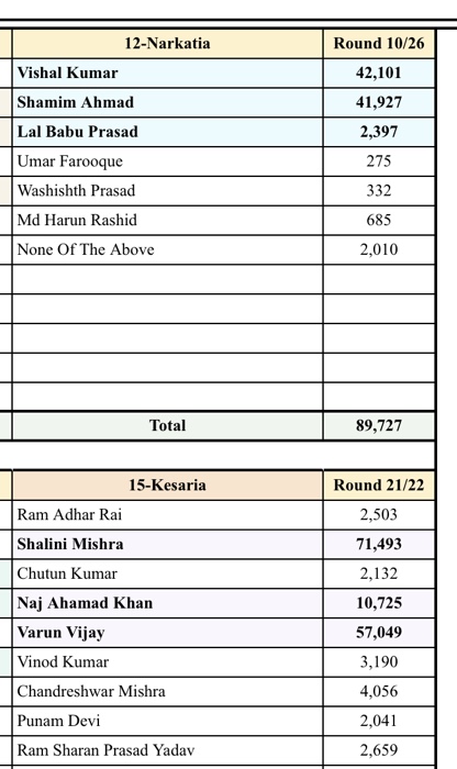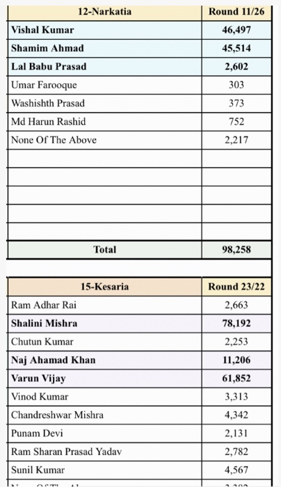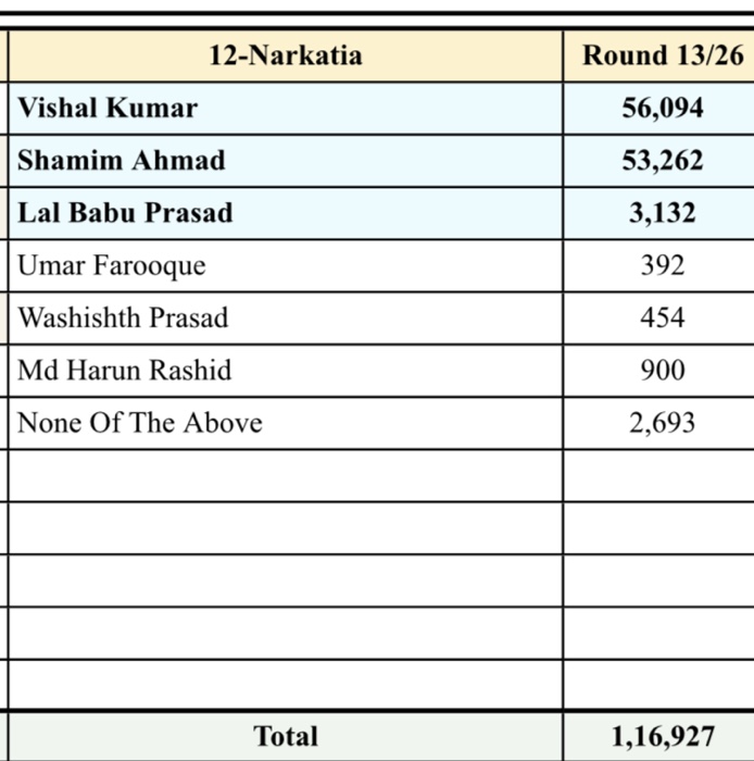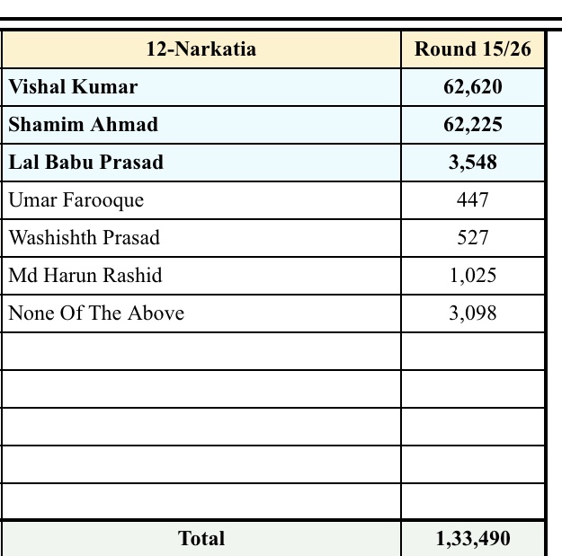 12 नरकटिया से विशाल कुमार को 56,094 व शमीम अहमद को 53,262