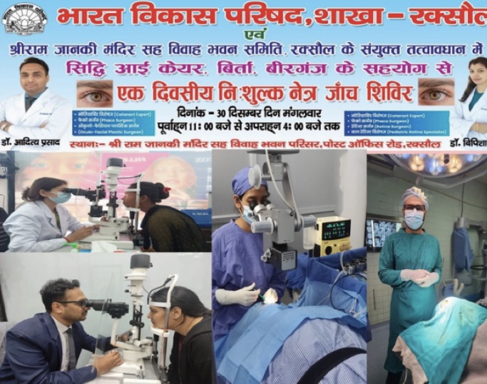 भारत विकास परिषद रक्सौल शाखा एवं श्रीराम जानकी मंदिर सह विवाह भवन समिति के संयुक्त तत्वावधान में मंगलवार, 30 दिसंबर को पोस्ट ऑफिस रोड स्थित श्रीराम जानकी मंदिर परिसर में नि:शुल्क नेत्र जांच शिविर का आयोजन किया जाएगा। यह शिविर पूर्वाह्न 11 बजे से अपराह्न 4 बजे तक चलेगा।