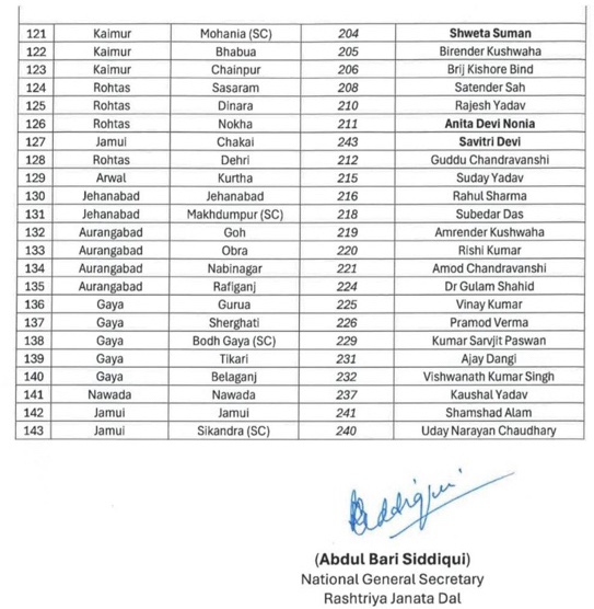 बिहारीगंज सीट से पूर्व मंत्री रेणु कुशवाहा, जो पहले जेडीयू कोटे से मंत्री रह चुकी हैं, अब आरजेडी के टिकट पर चुनाव लड़ेंगी।