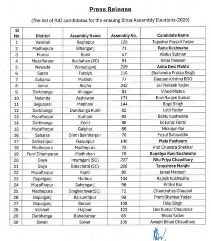 आरजेडी की इस सूची के सामने आने के बाद बिहार की सियासत में नई हलचल पैदा हो गई है। कई सीटों पर महागठबंधन के भीतर सीधी टक्कर होने की संभावना से आगामी चुनाव दिलचस्प हो गया है।