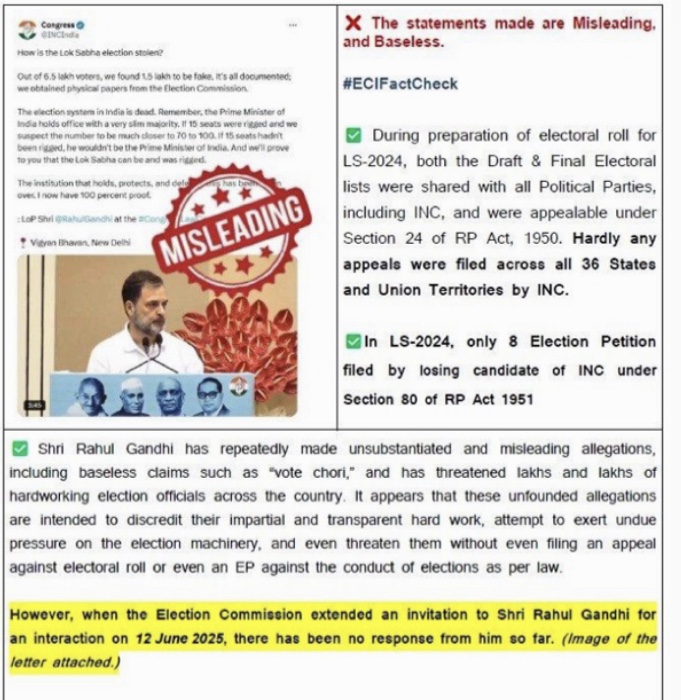 निर्वाचन आयोग ने सोशल मीडिया प्लेटफॉर्म ‘एक्स’ पर एक ”फैक्ट-चेक” पोस्ट में कहा कि राहुल गांधी के बयान ”भ्रामक और निराधार हैं”।